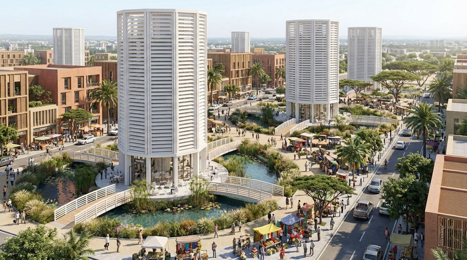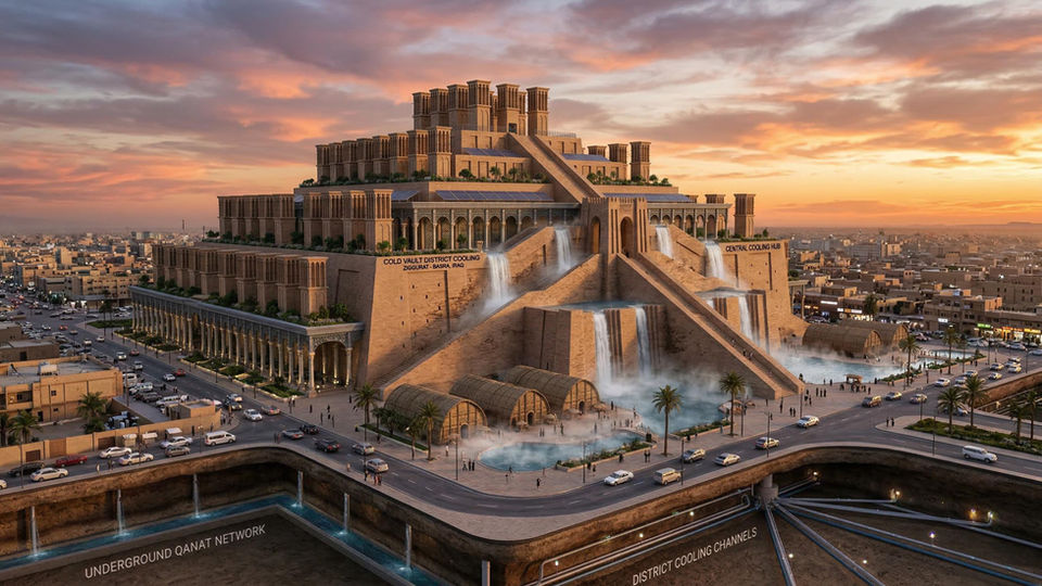 Smart Badgirs & Mudhifs: Modernized windcatchers and reed structures provide passive induction cooling and street-level microclimates, reducing active cooling needs by 60%.